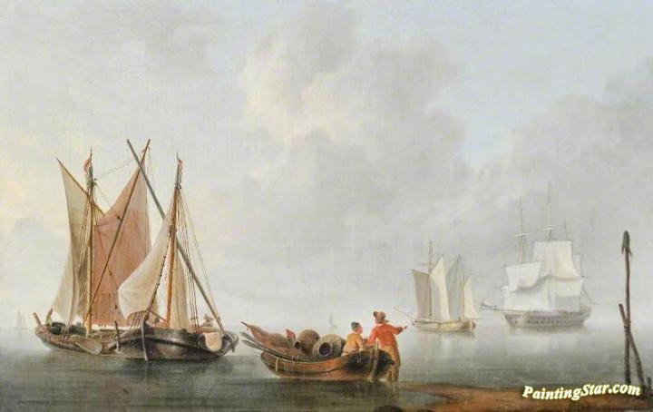 Fishermen and Boats with Two Sailing Ships Beyond, Art Painting by Charles Martin Powell