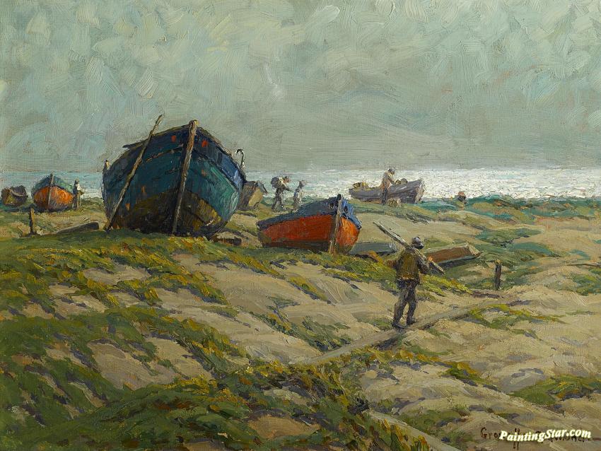 Fishermen And Fishing Boats On The Shore, Art Painting by Granville Redmond