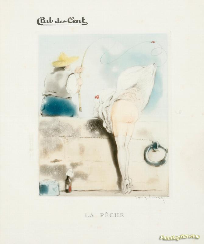 Fishing, From Club Des Cent Menu, Art Painting by Louis Icart