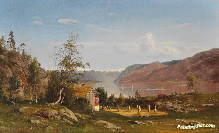 Fjord Landscape With Haystacks, Art Painting by Amaldus Clarin Nielsen