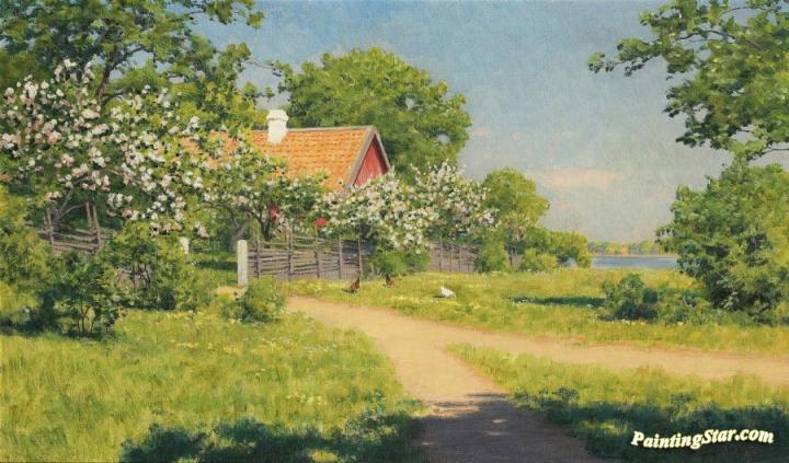 Flowering fruit trees by the red house, Art Painting by Johan Krouthén