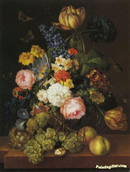 Flowers and fruit with a birds nest on a ledge, Art Painting by Franz Xavier Petter