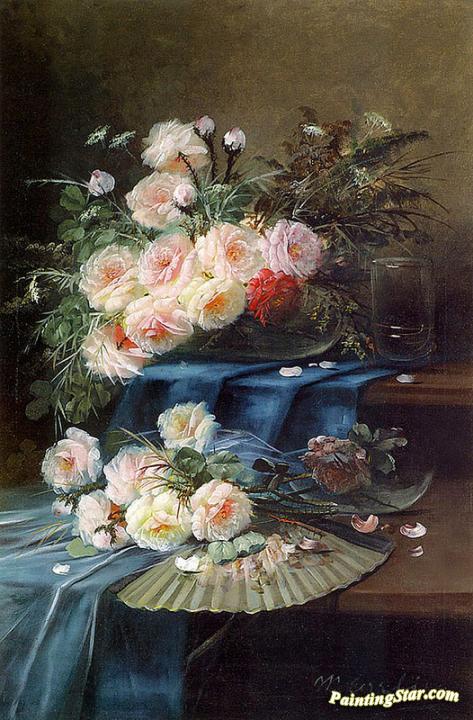 Flowers, Fan and a Glass on a Draped Table, Art Painting by Max Carlier