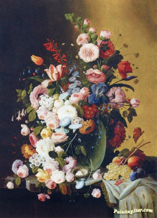 Flowers In A Glass Pitcher With Bird's Nest And Fruit, Art Painting by Severin Roesen