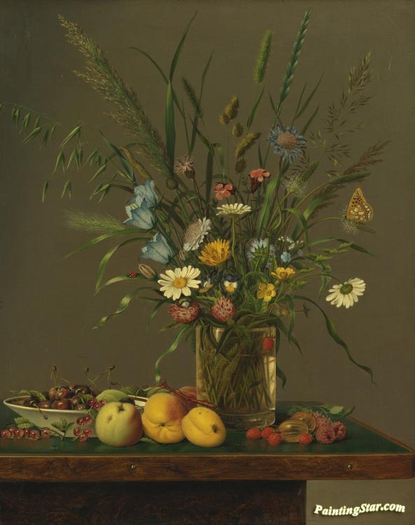 Flowers In A Glass Vase And An Arrangement Of Fruit, Art Painting by Anton Hartinger