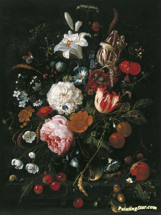 Flowers in a glass Vase with Fruit, Art Painting by Jan Davidsz De Heem