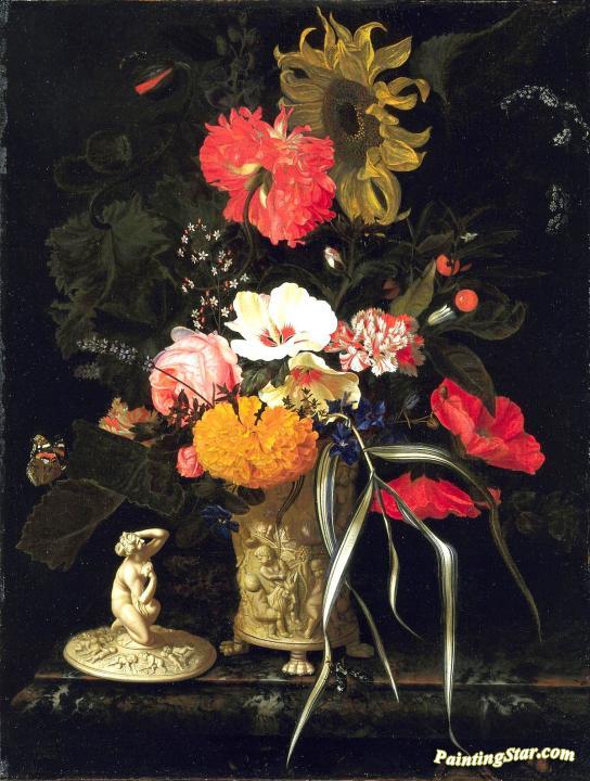 Flowers in a vase with embossed decorations, Art Painting by Maria van Oosterwijck