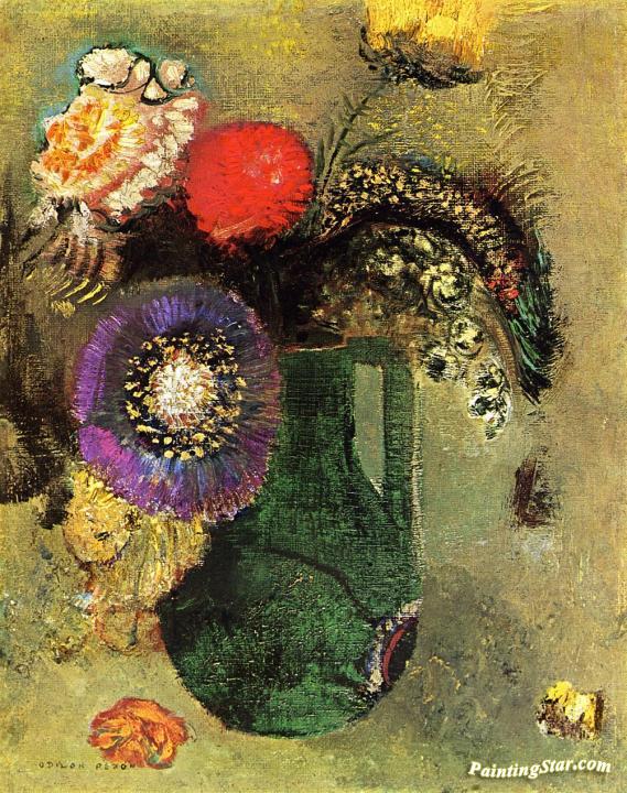 Flowers in Green Vase with Handles, Art Painting by Odilon Redon