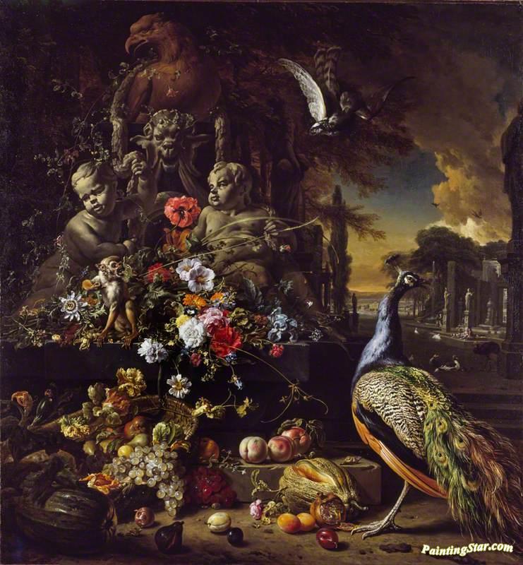 Flowers On A Fountain With A Peacock, Art Painting by Jan Weenix
