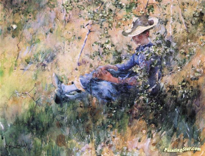 Girl by a Flowering Hawthorn Bush, Art Painting by Carl Larsson