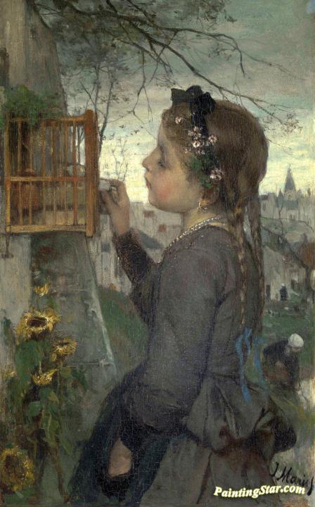 Girl feeding her Bird in a Cage, Art Painting by Jacob Maris