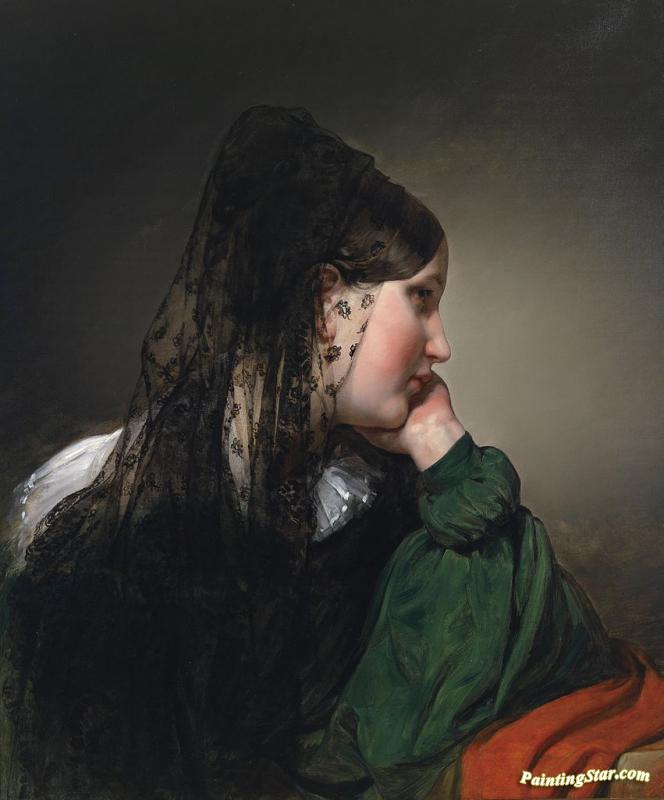 Girl In Profile With A Black Mantilla, Art Painting by Friedrich von Amerling