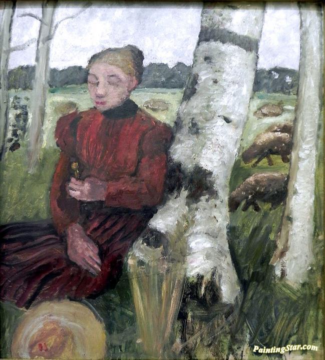 Girl resting on birch trunk, Art Painting by Paula Modersohn-Becker