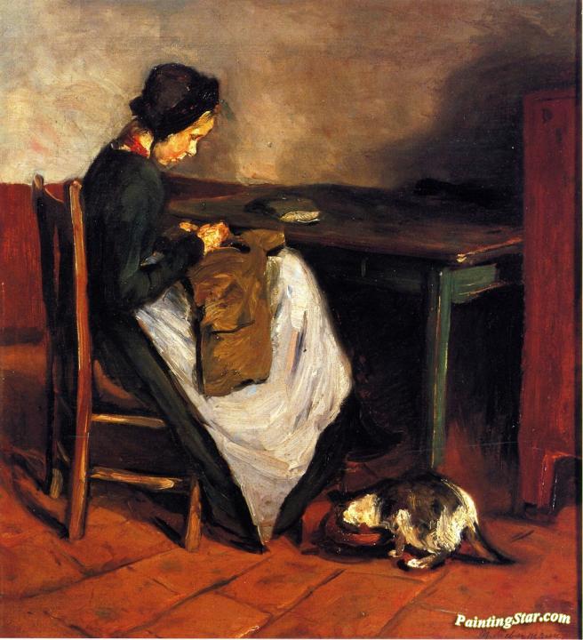 Girl Sewing with Cat - Dutch Interior, Art Painting by Max Liebermann