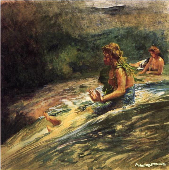 Girl Sliding down Water Fall, Banna Leaf Around Her Body, Art Painting by John La Farge