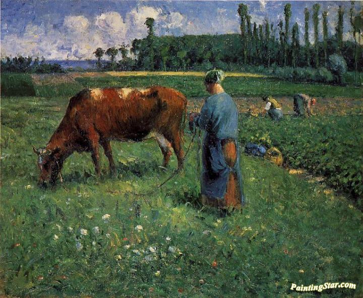 Girl Tending a Cow in a Pasture, Art Painting by Camille Pissarro