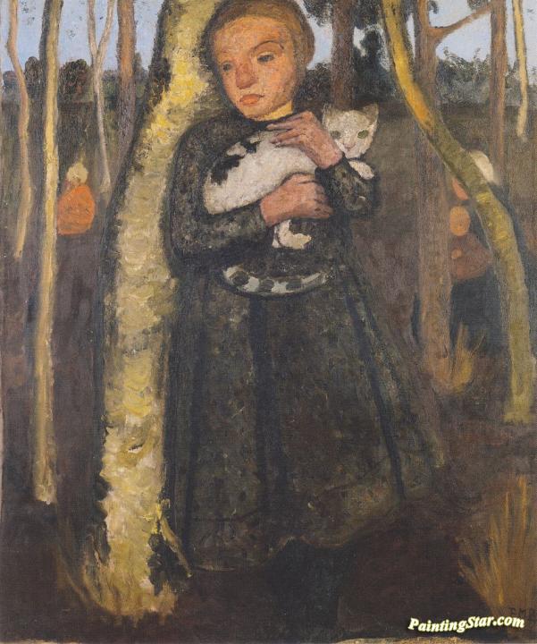 Girl with Cat in the birch forest, Art Painting by Paula Modersohn-Becker