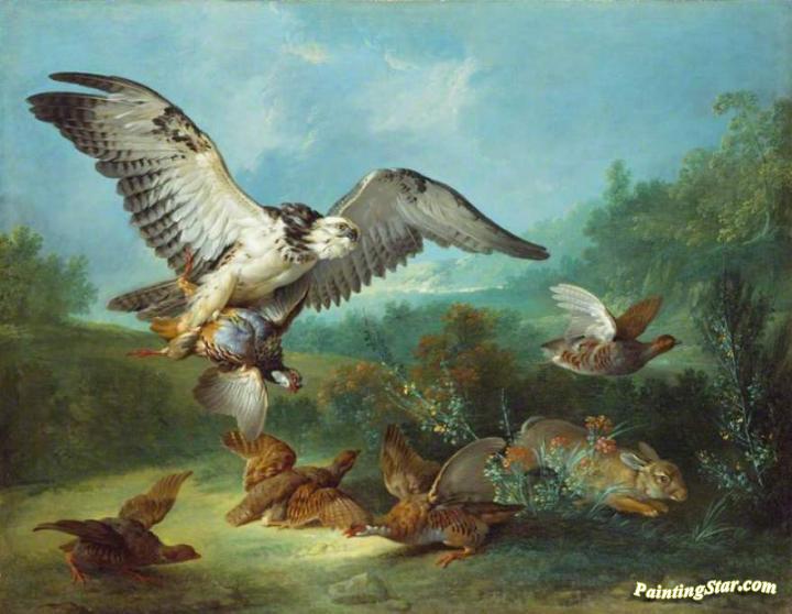 Hawk Attacking Partridges And A Rabbit, Art Painting by Jean-Baptiste Oudry