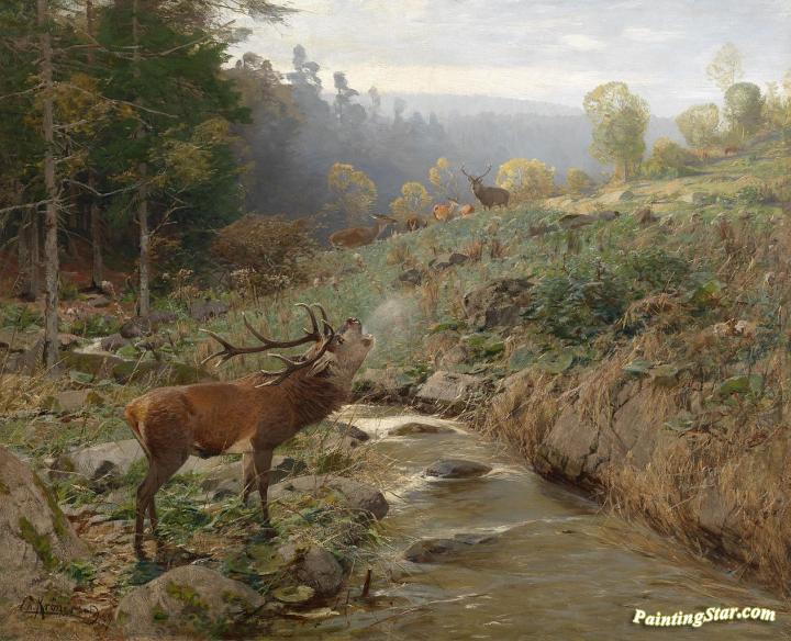 Herd of red deer in a forest clearing, Art Painting by Christian Johann Kroner