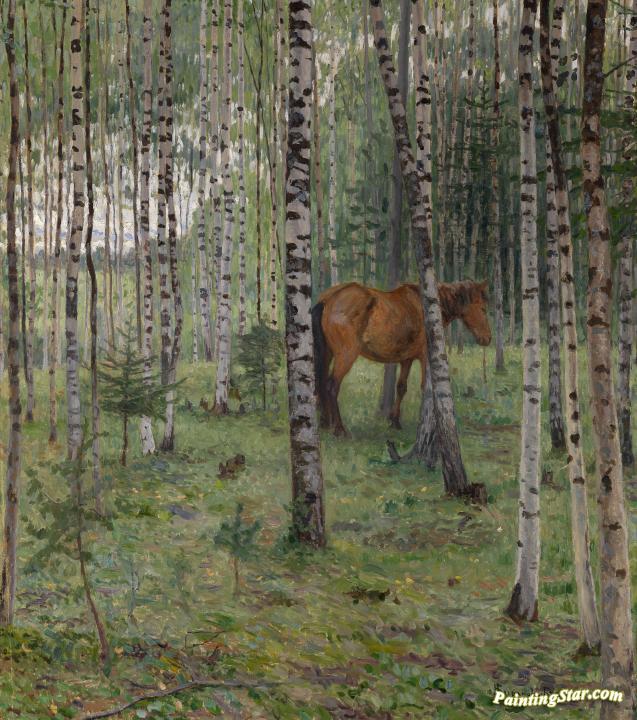 Horse in a Birch Grove, Art Painting by Nikolai Petrovich Bogdanov-belsky