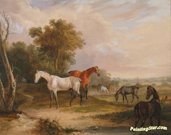 Horses Grazing,a Grey Stallion Grazing with Mares in a Meadow, Art Painting by Francis Calcraft Turner