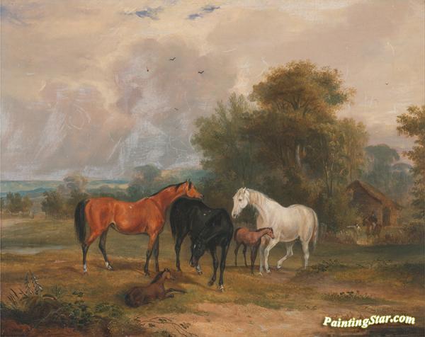 Horses Grazing,Mares and Foals in a Field, Art Painting by Francis Calcraft Turner