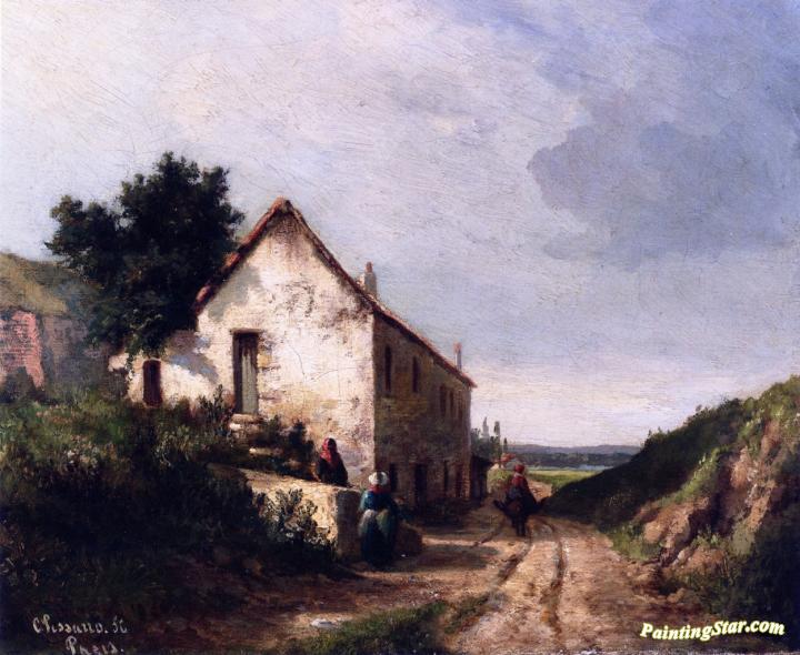 House by a Country Road with Figures, Art Painting by Camille Pissarro