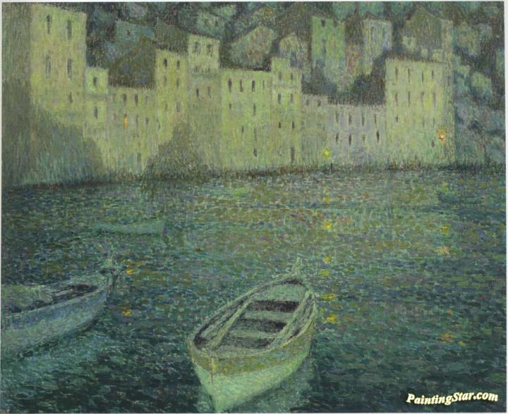 Houses by the Port in a full moon, Art Painting by Henri Le Sidaner