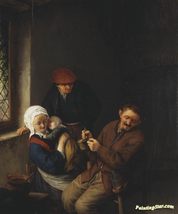 Interior of a Peasant's Cottage: A Child about to be Fed, Art Painting by Adriaen van Ostade