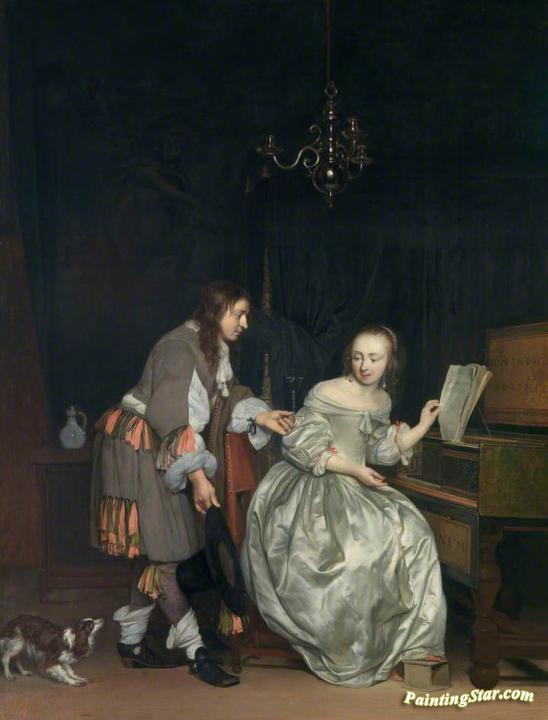 Interior with a Lady at a Spinet and a Gentleman Offering Her a Glass of Wine, Art Painting by Gabriel Metsu