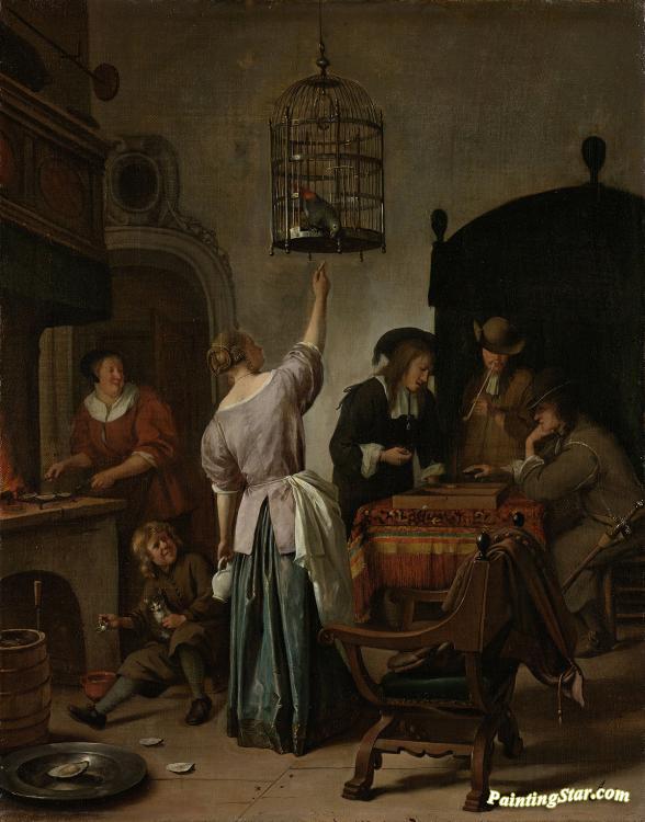 Interior With A Woman Feeding A Parrot(the Parrot Cage), Art Painting by Jan Steen
