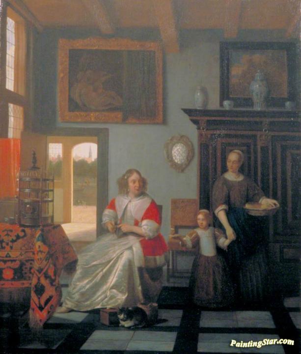 Interior with a Woman Knitting, a Serving Woman and a Child, Art Painting by Pieter de Hooch