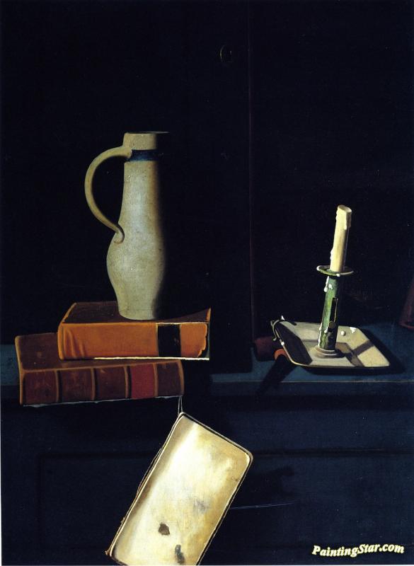 Jug, Books And Candle On A Cupboard Shelf, Art Painting by John Frederick Peto