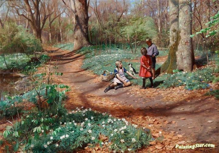 Kids picking anemones and violets in a forest with unfolding beeches, Art Painting by Peder Mork Monsted