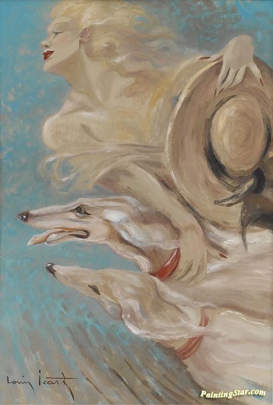 Lady With Two Dogs, Art Painting by Louis Icart