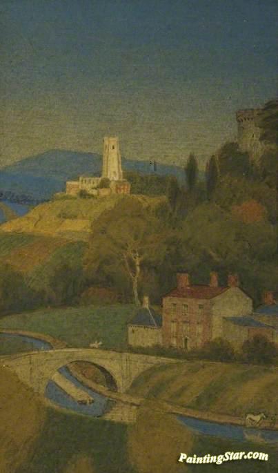 Landscape, Looking Down On A Valley With Distant Church And Canal, Art Painting by Joseph Edward Southall
