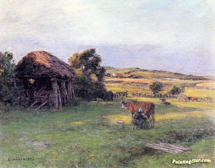 Landscape with a Peasant Woman Milking a Cow, Art Painting by Leon Augustin Lhermitte