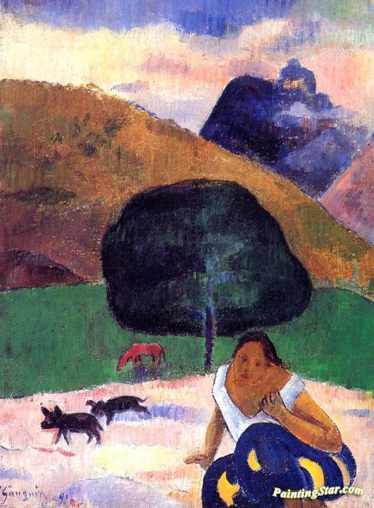 Landscape with Black Pigs and a Crouching Tahitian, Art Painting by Paul Gauguin