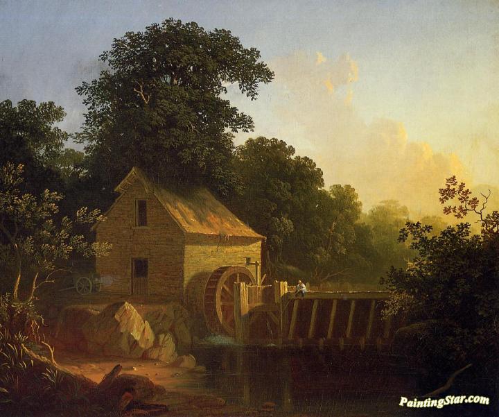 Landscape With Waterwheel And Boy Fishing, Art Painting by George Caleb Bingham