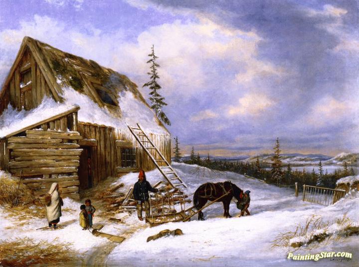 Log Cabin, Winter Scene, Lake St. Charles, Art Painting by Cornelius Krieghoff