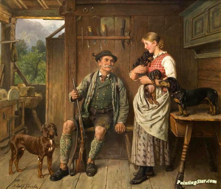 Maid, Huntsman And Dachshund Family, Art Painting by Adolf Eberle