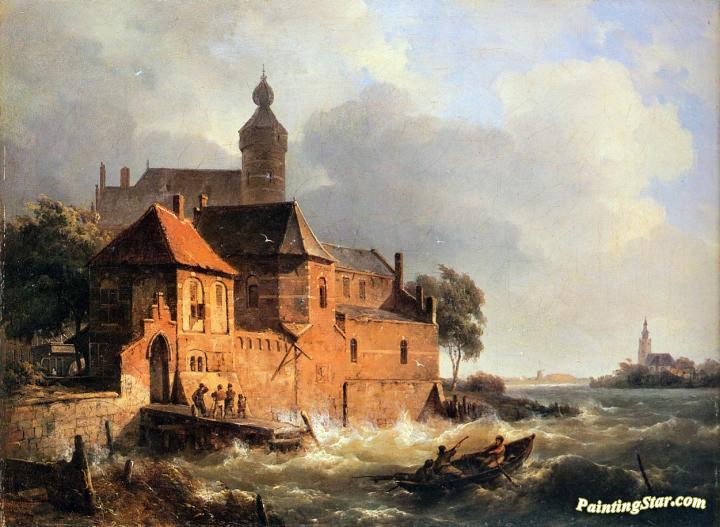 Men in boat at choppy sea, Art Painting by Cornelius Springer