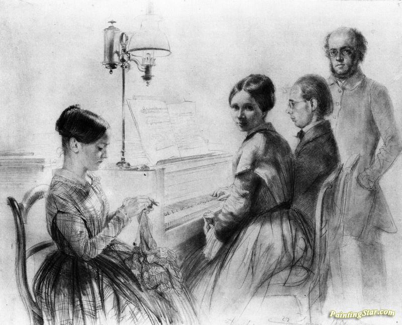 Menzel With His Brother, Sister And A Relative Next To The Upright Piano, Art Painting by Adolph von Menzel