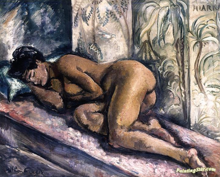 Miarka, Nude Lying On A Bed In Front Of A Screen, Art Painting by Emile-othon Friesz