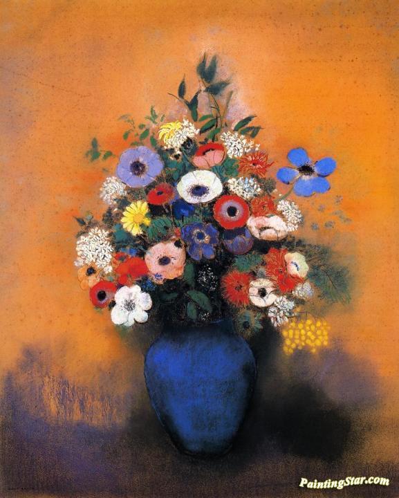 Minosas, Anemonies and Leaves in a Blue Vase, Art Painting by Odilon Redon