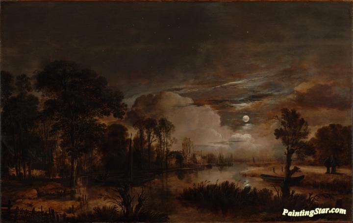 Moonlit Landscape with a View of the New Amstel River and Castle Kostverloren, Art Painting by Aert van der Neer
