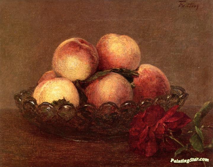 Nature Morte: Peches Dans Une Coupe De Verre, Une Rose Fonces Avec Des Feuilles A Droite, Art Painting by Henri Fantin-Latour