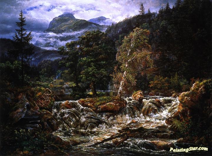 Norwegian Mountain Landscape with Waterfall, Art Painting by Johan Christian Dahl