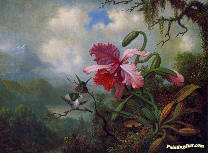 Orchid and Hummingbirds near a Mountain Lake, Art Painting by Martin Johnson Heade