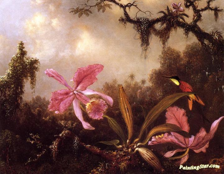 Orchids And Crimson Topaz Hummingbird, Art Painting by Martin Johnson Heade